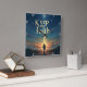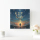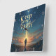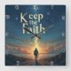 This evocative wall clock features a solitary figure on a path, walking towards a brilliant light source emerging from the distant horizon over calm waters, under a vast, star-dusted twilight sky. The timeless directive, "Keep the Faith," is boldly displayed above. With its dramatic, textured artistry and clear numerals, this timepiece serves as a constant, inspiring reminder to maintain unwavering belief and continue forward on one's spiritual journey, guided by an enduring light.