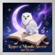 Mystical white owl perched on a spellbook under a crescent moon. Fantasy digital art with cosmic background.