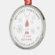 Modern keepsake baby's first Christmas personalise ornament with baby's name, baby's stats and line art of cosy reindeer wearing festive red sweater and boots.
