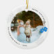 Modern Christmas Holiday keepsake ornament with round photo, snowflakes, blue mittens and modern font.