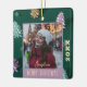 Celebrate the holiday season with this chic and modern personalised Christmas ornament—the perfect keepsake to cherish for years to come. Featuring a sophisticated deep green background, this ornament is adorned with trendy pastel and gold accents, including whimsical trees and delicate snowflakes that add a magical holiday touch. The front of the ornament showcases your cherished photo, bordered by a soft lavender frame, along with your name in elegant script and a bold “Merry Christmas” in modern typography. The gold “2024” adds a timeless detail, balancing the design while marking the special year.