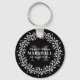 Floral Wreath Calligraphy Typography Monogram Keychain in Black and White - Stylish black and white monogrammed keychain gift for a newly wed couple that features a custom monogram, groom & bride names, last name, and wedding date templates surrounded by a bold floral line art wreath. A thoughtful keepsake gift for a couple's housewarming party or wedding present. ©sweetwhimsypaperie