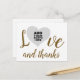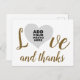 A white postcard to add your own photo inside the shape of a heart of love, written "love and thanks" in handwritten font style... an elegant idea to say thank you to those who have been with you at your wedding