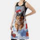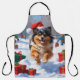 Keeshond Dog Running in Snow with Christmas Hat Apron