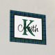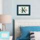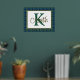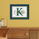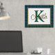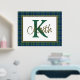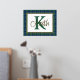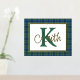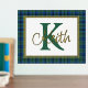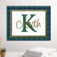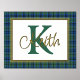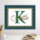 Handsome tartan plaid foil print, with a gold foil framed in text area, against the Scottish clan Keith tartan pattern background. A large green single letter monogram and gold foil name are ready to personalise.
