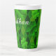 Irish themed tall latte mug with place for a name in script lettering. Green argyle pattern and 4-leaf clover design and name in white.