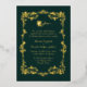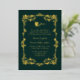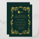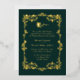 Ornate gold foil wedding invitation done in Kelly Green with gold rose vines framing the text area and a single long stem rose at the top of the text area. Personalise the foil text to suit your wedding needs.