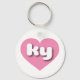 This key ring features a vibrant pink heart containing the bold, white, rounded lower case letters ky, a playful abbreviation for the state of Kentucky, the bluegrass state.