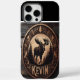 A close-up of a wooden carving featuring a moose standing in a forest with the name Kevin inscribed below.