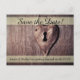 Save the date postcard with metal heart-shaped lock on rustic wooden door.