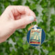 This Greetings From Key West Florida vintage travel nautical design features a boat sailing on the water with seagulls and a blue sky filled with gorgeous puffy white clouds.