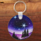This enchanting digital artwork encapsulates the vast starry sky within a perfect circular world. The piece is dominated by deep blue and purple gradients, creating a tranquil and mysterious night. Several radiant starbursts glitter in the firmament as if lit by magic. Below, silhouetted pine trees and a purple horizon evoke the dreamy atmosphere of a cold winter or the far North. This design is imbued with a sense of fantasy, romance, and festivity, making it ideal for conveying well wishes, enhancing decor, or serving as a unique gift design. Its circular composition and distinct landscape bring a unique and captivating visual effect to any product.