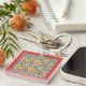 A pretty square acrylic Keychain, with a pattern of ditzy orange, red and yellow flowers on a turquoise blue background; from a handpainted paper collage by Judy Adamson.