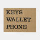 Jokey doormat with the words KEYS WALLET PHONE in a grungy big bold black text on a burlap effect background.