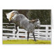 A Dapple Grey horse photographed mid-kick on a sunny Fall morning. Dapples are a colour variation most commonly seen on grey horses.
