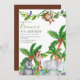 Sweet animal safari, childrens birthday party invitation, featuring a jungle safari theme, with palm trees, tropical flowers, a tortoise, a monkey, rhino, giraffe and parrot. The invitation has an easy to customise birthday party invitation template, the font styles, sizes and colours can be changed by clicking on the customise further link after personalising.