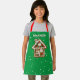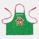 Kid's baking apron with cute gingerbread house in the snow. Personalised Christmas aprons for children. Green and red colours with ginger cookie decorated with sweet candy and icing. Fun Holiday gift idea for daughter, son, grandchildren, friends etc. Add your own custom name or quote. Also great for cooking in the kitchen or art and crafts.