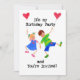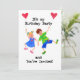 A Kids Birthday Party Invitation with two kids holding heart-shaped balloons, from a handpainted paper collage by Judy Adamson. The reverse of the card is left blank for you to fill in the details and please contact me through my store if you'd like me to change the front text in some way.