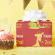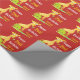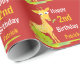 Kids Happy Birthday Personalised Giraffe Animal Watercolor Wrapping Paper. Bright red background with a repeating pattern of fun giraffes. Watercolor style giraffes in yellow and orange behind green bushes. Personalise in white and yellow fun font to say HAPPY BIRTHDAY with name and age of birthday boy or girl.