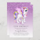 Girls 13th ( or any other) birthday invitation featuring unicorn face, sparkles, glitter and foil graphics (not real glitter or foil) in pink, gold, purple, lilac shades. Perfect for Quinceanera, baby or bridal shower, 40th, 30th, 50th, 18th, 21st Birthday.