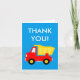 Kids birthday thank you card with dump truck. Cute boys toy dumptruck design to say thanks for coming to the baby shower or 1st birthday party. Customisable background colour. Custom thankyou message on inside. Modern typography.