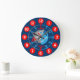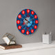 Colourful kids boys graphic wall clock colour coded to help assist your child to read a clock featuring a space rocket and your name . This colourful teaching aid includes minutes and hours and past and to colour coding making child's play of telling the time. Designed exclusively by Sarah Trett. A great addition to a boy's bedroom for children who are learning to read a clock face. colour coded in red, blue, grey and white.