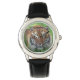 Kids classic black leather strap watch shown with a wildlife exotic tiger photo print. Choose this watch from several styles. Customise this watch or buy as is. Stock Image