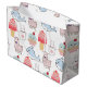 Cute kid's gift bag done in white with a fun colourful cartoon Kawaii pattern, of llamas, whales, bunnies, cupcakes, and ice cream cones. Customise to add any text you want.