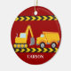 Cool custom construction excavator and dump truck Christmas ornament for a child who loves yellow construction vehicles in black and yellow. Fun red vehicle gift for a little boy who loves cars and trucks. Customise with your kid's name under the black and yellow caution tape.