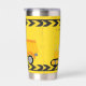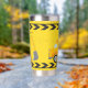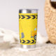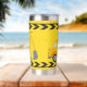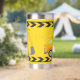 Cool custom construction excavator tumbler gift for a child who loves yellow construction vehicles in black and yellow. Fun vehicle gift for a little boy who loves cars and trucks. Customise with your kid's name under the black and yellow caution tape. The back features a dump truck.