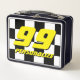 Kid's custom lunch box with chequered car race flag design. Retro style metal lunch box with name of child and number. Personalised gift ideas for little boys and girls going to kindergarten and preschool. Classic metallic lunchbox with handle. Cute Birthday or Holiday gift idea for son, grandson, granddaughter, daughter, cousin, nephew etc. Add your own name, monogram initials or funny quote. Available in many colours. Cool back to school supplies with automotive theme.