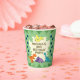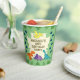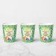Cute dinosaur birthday party paper cups featuring yellow, blue, orange and purple dinosaurs on a green foliage background. These adorable cups also have templates so you can add your own details for your child's special day.