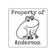 Kids Frog Personalised Property Of Cartoon Animal Rubber Stamp. Fun cartoon frog outline in the centre of this kids stamp. Personalise with name, all text is editable "property of" on top of cute frog and name underneath. Label your stuff with this silly cartoon frog.