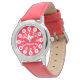 Graphic art kids watch featuring a simple white butterfly o a red pink background. Great for school age girls learning to read a clock as features both minutes and hours. Customise with your child's name example reads Sienna.