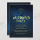 Halloween party invitation featuring a full moon, flying bats on a dark starry night sky. The invitation reads: Halloween Party