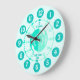 Kids graphic wall clock shaded to help assist your child to read a clock. This colourful clock in shades of mint aqua and green works as a teaching aid which includes minutes and hours and coded past and to's making child's play of telling the time. Designed exclusively by Sarah Trett. A great addition to a child's bedroom who is learning to read a clock face.