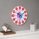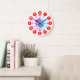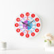 Colorful kids graphic wall clock color coded to help assist your child to read a clock. This colorful teaching aid includes minutes and hours and past and to color coding making child's play of telling the time. Designed exclusively by Sarah Trett. A great addition to a child's bedroom or play room for children who are learning to read a clock face. color coded in purple, blue and red.