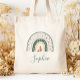 This tote bag features a boho rainbow decorated with hearts and polka dots in earth tones of green, gold and dusty rose. Personalise it with her name in dark green handwriting script.