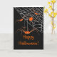 Greeting card with my original digital design of cute little orange spiders in a web. Text says "Happy Halloween!"