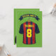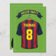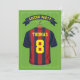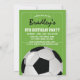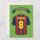 Soccer theme birthday party invitations featuring a green football pitch background, a burgundy & blue striped sports shirt with your name and number, a soccer ball, and a modern party template.