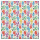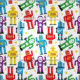 Colourful kid's patterned fabric covered with red, blue, purple, yellow and green retro toy robots and aliens on white