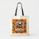 Kids trick or treat tote bag for Halloween party. Can also be used as favour bag for Birthday parties. Scary spider in spiderweb. Personalised name of child (boy or girl). Black widow / tarantula spider in web. Black and orange colours.