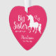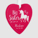 Sisters Pink and Purple Unicorn Little Sister Personalised Christmas Ornament. Personalise this adorable ornament with name underneath a beautiful white unicorn silhouette. Text in white reads BIG SISTER with pretty hearts and curling lines on pinkish red background. Back of ornament has place for the year on dark purple background. Pretty unicorn themed holiday ornament. Customise to change background to any other colour. Coordinate with other sibling gifts. Unicorn Christmas Keepsake.