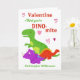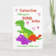 A fun Dinosaur Dino-mite design with a cartoon baby T Rex, a purple Triceratops and a red Stegosaurus. with the wording - Valentine , I think you're Dino-mite. A sweet and cute design the holidays for boys and girls who love Dinosaurs to send for valentines day. Can be personalised by amending the name at the bottom of the card