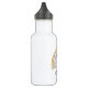 A cool personalised kid's watercolor boho rainbow stainless steel white water bottle, featuring a pink mustard and blue rainbow with pink heart in the middle and personalise with your name.