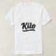 This t-shirt design features the word "kilo" in a bold, white cursive font that pops against a black background. The typography is playful and energetic, making it a fun and eye-catching design.