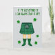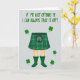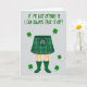 This card shows a light grey background with the lower half of a figure centered, dressed in a green tartan kilt with clear plaid lines and a small pouch detail at the front. Bare legs extend down into emerald green rain boots, and the cheeky outfit pairing feels like an inside joke you’d share with a close friend 💚. Across the top, the phrase “IF ME KILT OFFENDS YE I CAN ALWAYS TAKE IT OFF!” sits in a chunky, hand-drawn green font that stretches wide and grabs attention. The letters look slightly uneven in a natural way, like a quick note meant to tease someone you like without being mean. Small four-leaf clovers are sprinkled around the figure, echoing the green tones and adding a flirty wink of good luck ☘️. The palette stays mostly greens against the pale grey, keeping the focus on the kilt, boots, and headline. Several clovers float near the sides and corners, framing the central legs and leaving open space around the top text.