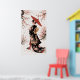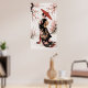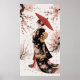 This stunning wall art poster features a delicate digital painting of a graceful woman in a black kimono, strolling through a serene, blossoming garden. She holds a beautiful red paper parasol, which adds a striking pop of colour against the soft, muted tones of the background.