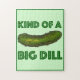 Puzzle design features an original marker illustration of a green kosher dill pickle, with KIND OF A BIG DILL in a fun green font.