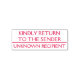 This simple rubber stamp design features the messages "KINDLY RETURN TO THE SENDER" and "UNKNOWN RECIPIENT". It could be used to indicate that received mail has been delivered to the wrong address or that the recipient is unknown, and should be returned to the sender.